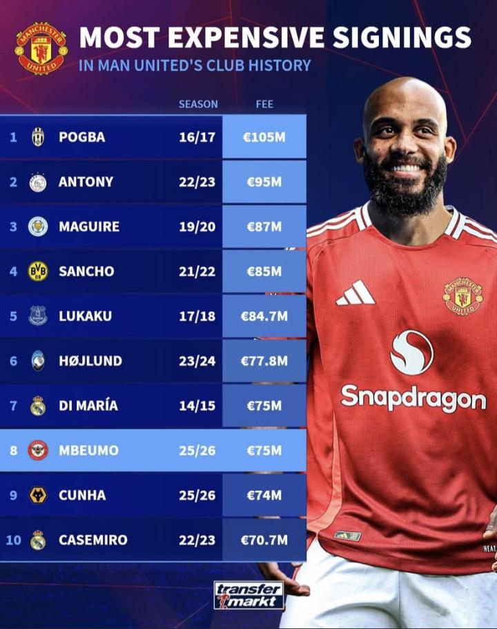 北京时间7月22日,在姆贝乌莫正式加盟曼联之后,德转统计出了红魔队史引援转会费排名前十的交易,博格巴1.05亿欧元排名第一,姆贝乌莫7500万欧元位居第八位。
