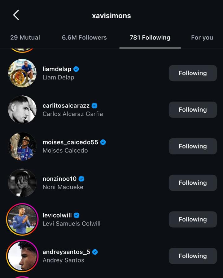 近日,莱比锡球员哈维-西蒙斯在社交媒体上关注了多名切尔西的球员。