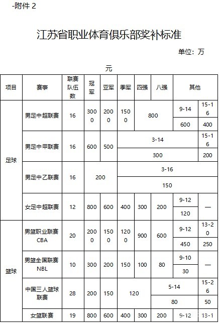 北京时间7月27日,江苏省体育局发布《省体育局关于组织申报2026年度省体育事业发展专项资金(职业体育俱乐部发展)奖补资金》的通知。其中对中超冠军奖补3000万元,亚军2000万元,季军1500万元,4-8名800万元,9-14名600万元,15-16名400万元;对中甲冠军奖补600万元,中乙冠军奖补200万元。中女超冠军奖补800万元。