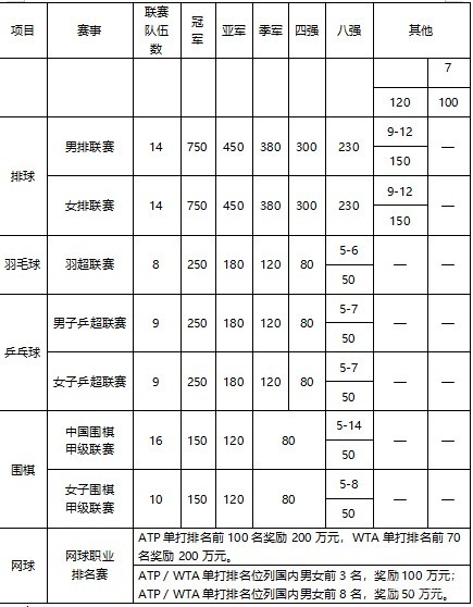 1.俱乐部参加上一赛季全国高级别职业联赛,且没有被降级,除足球、篮球(CBA、NBL)外,其他运动项目联赛最后两名不予奖补。