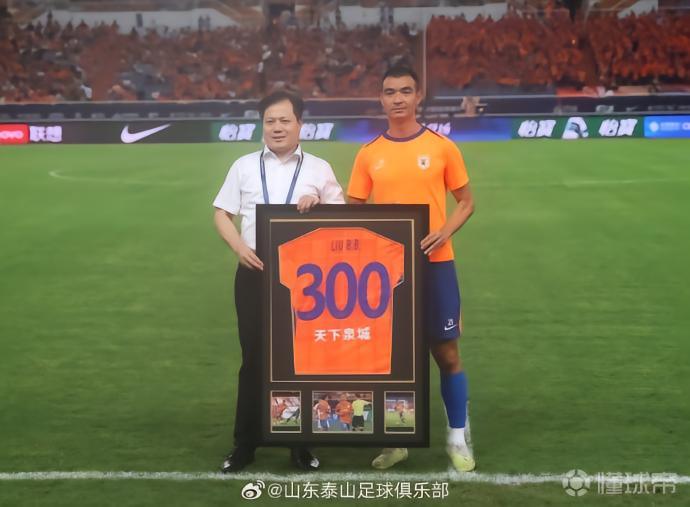 北京时间7月27日,中超第18轮,山东泰山坐镇主场迎战梅州客家,赛前,刘彬彬领取了泰山300场纪念球衣。