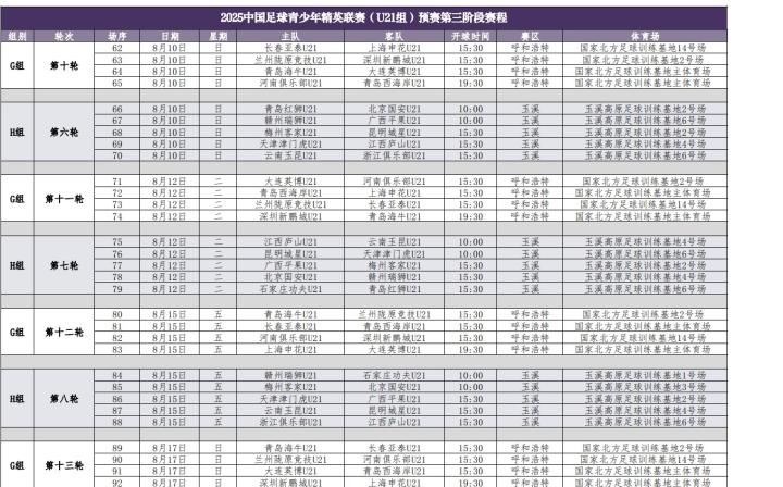 北京时间7月28日,中足联官方公布U21联赛预赛第三阶段赛程,2025赛季U21联赛预赛第三阶段将于8月10日至8月22日期间在呼和浩特和玉溪两个赛区进行。
