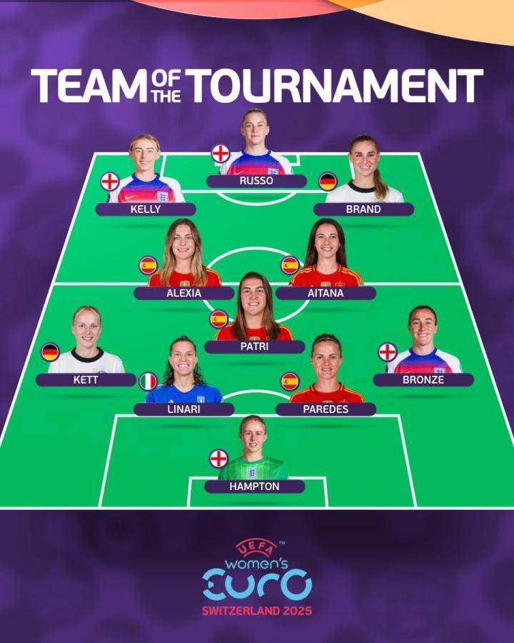 欧洲杯官方公布了本届女足赛事的最佳阵容,其中,英格兰与西班牙4人入选,布兰德在列。