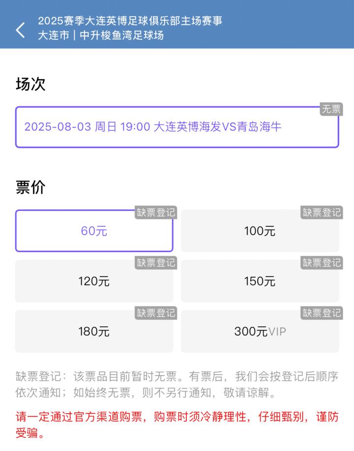 北京时间7月29日14:00,中超第19轮,大连英博主场对阵青岛海牛的球票正式开售,开票后仅5分钟便已售罄。