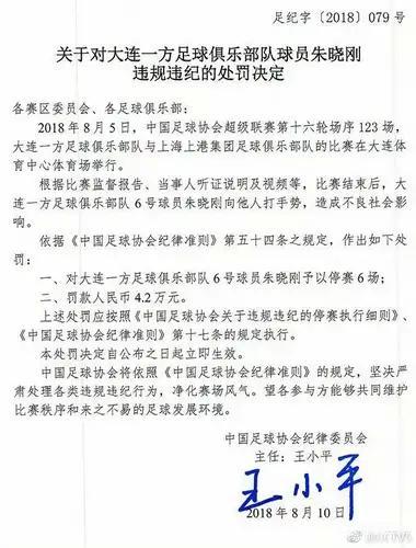 此前,朱晓刚曾因赛后向他人打手势造成不良影响被停赛6场、罚款人民币4.2万元。