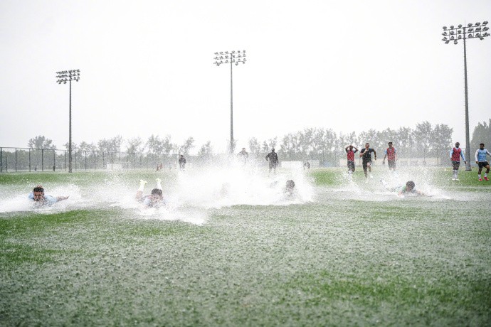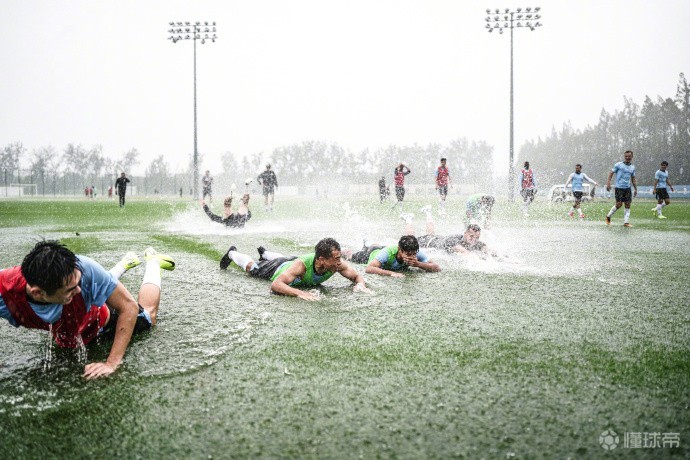 从组图中可以看到,申花的队员在训练结束后,集体“滑水”,训练的氛围并没有受到暴雨的影响。