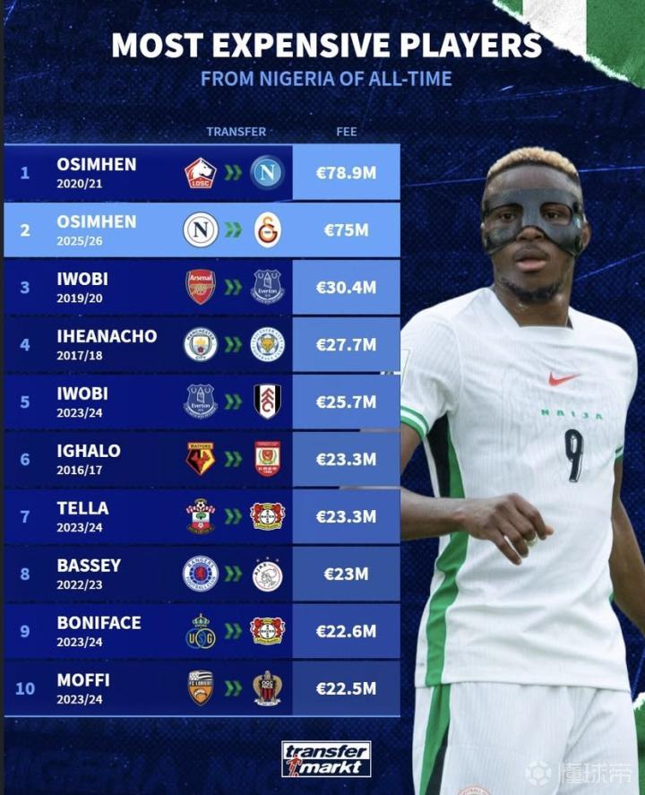北京时间7月31日,在奥斯梅恩即将正式以7500万欧元的价格转会加拉塔萨雷的情况下,德转统计出了尼日利亚球员历史转会身价榜,奥斯梅恩独占前二。