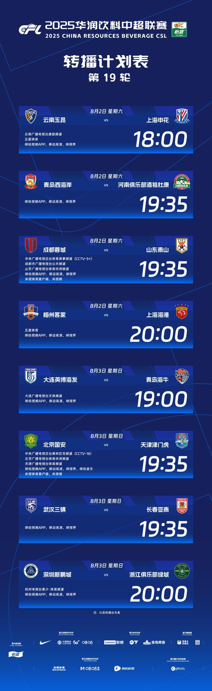 北京时间8月1日,中超官方消息,CCTV5+将转播本轮中超成都vs山东,CCTV16转播国安vs津门虎。