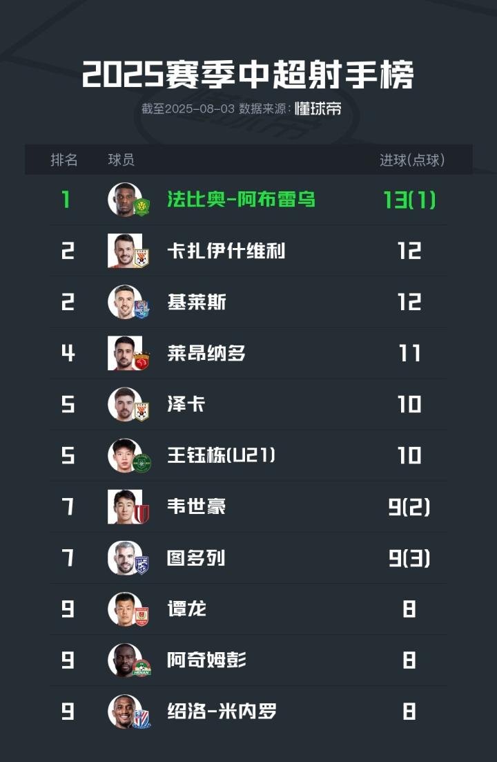中超第19轮比赛在今天晚上全部结束,目前,法比奥-阿布雷乌以13球位居中超射手榜第一名,卡扎伊什维利、基莱斯则并列第二名。