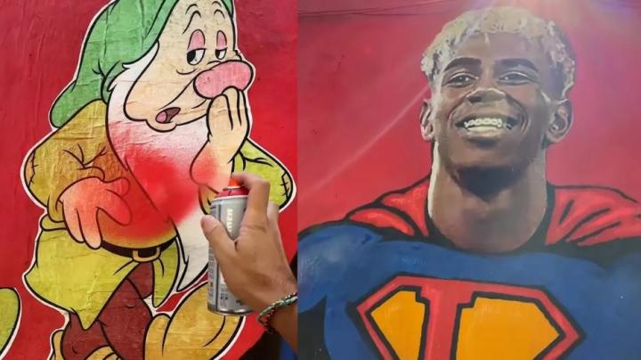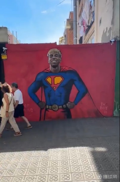 TVBoy的作品将亚马尔描绘成胸口印有“L”标志的超级英雄,既致敬其成年礼,也礼赞其火箭般蹿升的职业生涯。据悉,涂鸦破坏者疑似另一位街头艺术家Shredder,他在TVBoy作品上留下了签名。