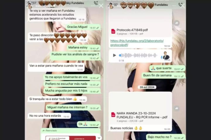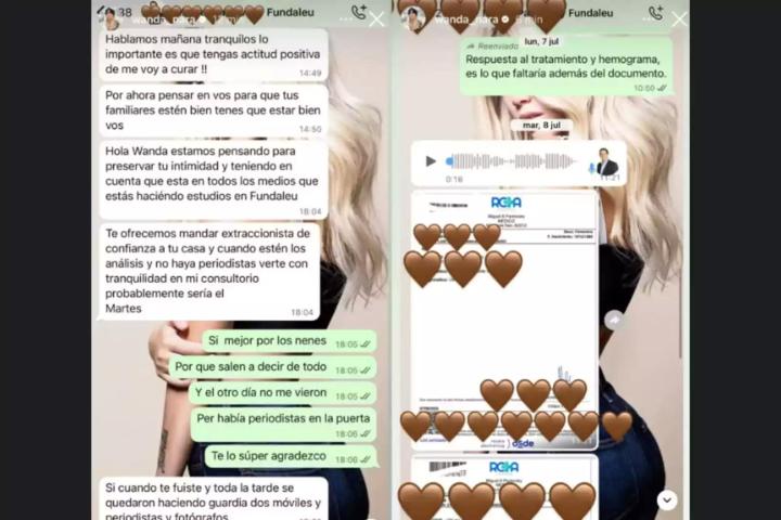 为证清白,旺达公布了在Fundaleu白血病治疗中心的医患聊天记录。对话中她焦虑表示“为孩子承受巨大痛苦”,医生则多方安抚。截图包含医疗报告、治疗程序及用药细节。