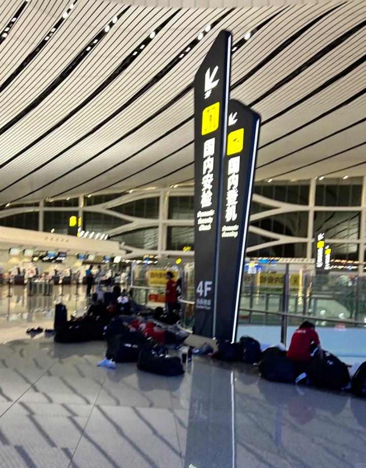 8.6晚上就是她们第一场比赛了,8.4晚上刚落地北京,在机场打地铺估计是等5号早上的飞机去银川,好极限啊。”
