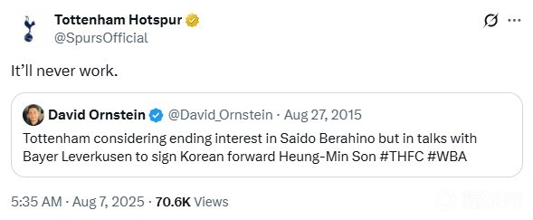 热刺官方“挖坟”转发了大卫-奥恩斯坦的这条动态,并表示:“这绝对行不通。”事实上,这正是当时那条动态的评论区里的热刺球迷的普遍反应。不过在那之后的故事,大家现在都已经知道了……