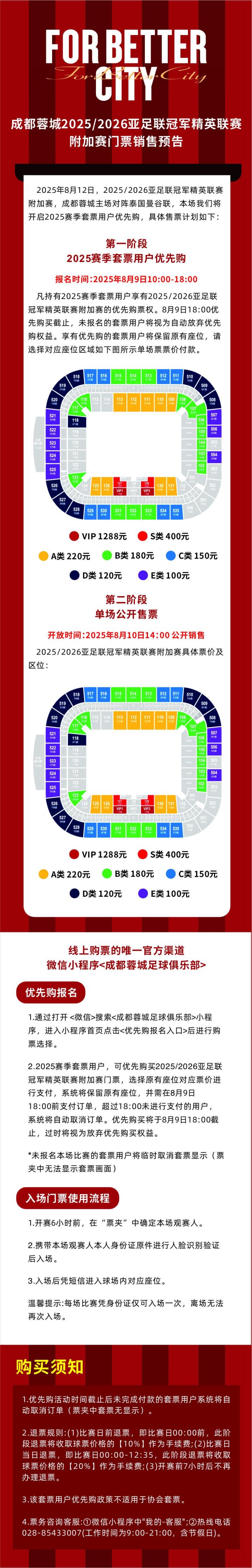 北京时间8月7日,成都蓉城官方发布了亚冠精英赛附加赛的门票公告,其中持有成都蓉城本赛季套票的球迷可以在8月9日10点开始抢票,而8月10日14:00将进行单场票公开发售。