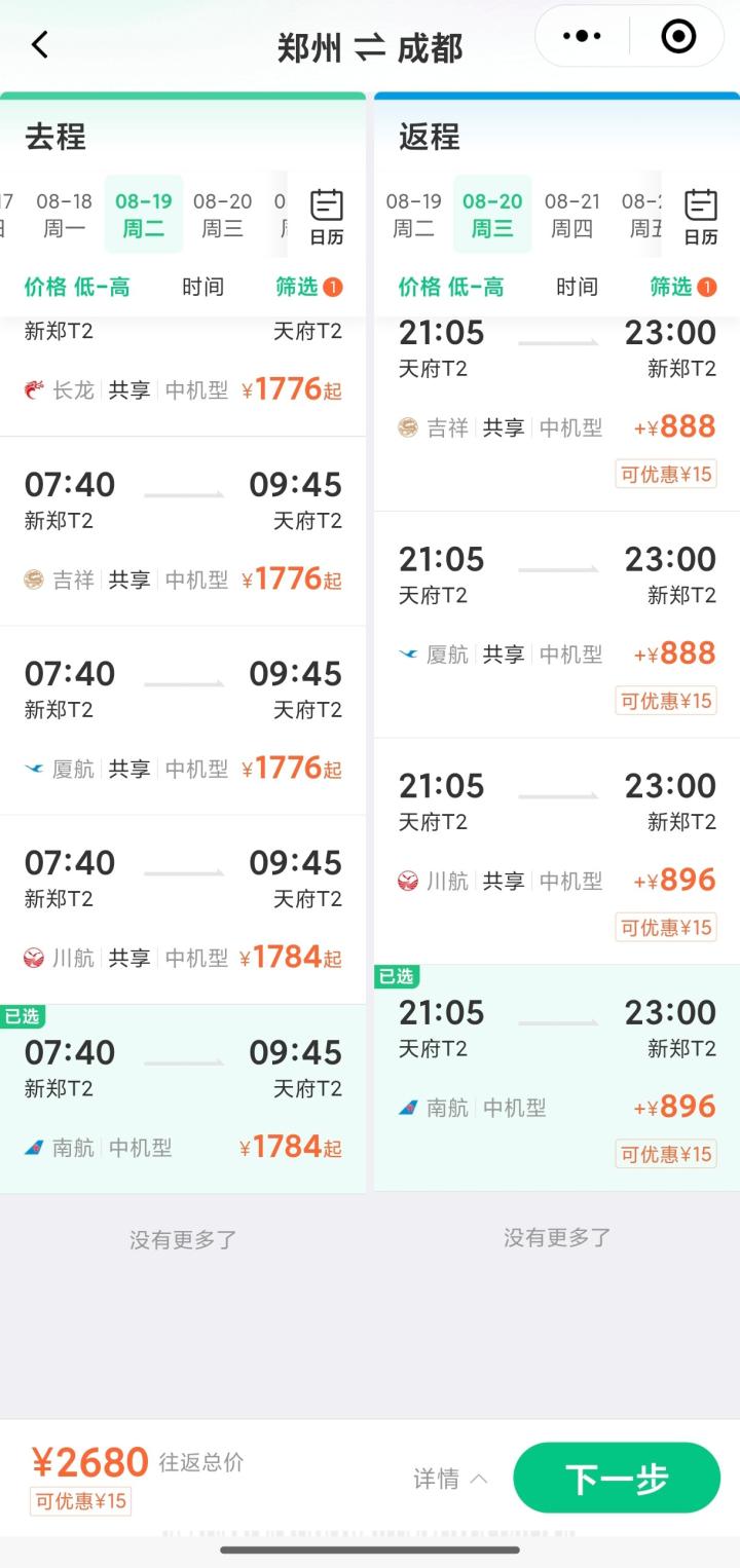 返程:8月20日成都天府—郑州新郑,航班号CZ6474,起飞时间 21:05,到达时间 23:00。