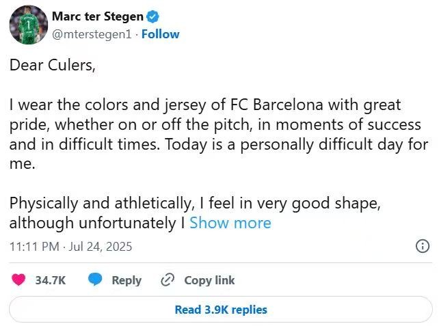 巴萨消息人士称,他们对自7月24日特尔施特根在社交媒体发文后事态升级感到困惑。俱乐部主席拉波尔塔和体育总监德科对德国人写的这条信息尤为愤怒,因为该信息是在他手术前发布的,且俱乐部事先并不知情。