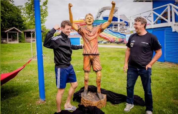 拍品涵盖多件穆勒在拜仁时期的经典物品,包括他亲自穿过的球衣、连帽衫、710双亲笔签名的阿迪达斯F50足球鞋,以及别具意义的特殊物件——5月10日拜仁主场2-0战胜门兴时的角旗,以及由200年树龄橡木雕刻而成的真人大小木雕穆勒像(高2.25米、重180公斤),该雕塑由埃尔丁温泉捐赠。
