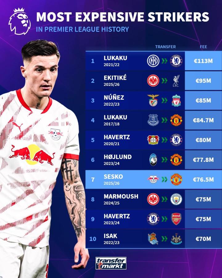 谢什科以7650万欧从莱比锡转会加盟曼联,德国转会市场网站列出了英超历史转会费最贵中锋排行,谢什科排名第七。