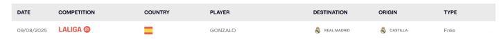 西甲官网显示,当地时间8月9日,贡萨洛-加西亚被注册进皇家马德里一线队,球衣号码为16号。