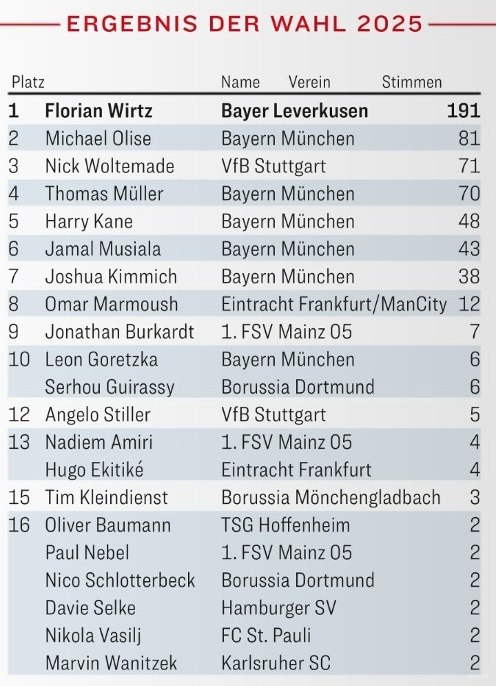 北京时间8月10日,维尔茨当选《踢球者》年度足球先生。据公布的投票数据,维尔茨总共获得191票,第二名奥利塞获得81票。