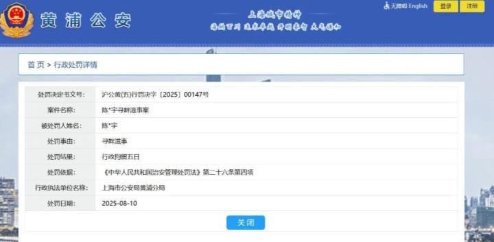 北京时间8月10日,上海黄浦公安公布了最新的行政处罚,陈某因寻衅滋事被处以行政拘留五日的处罚。博主“SIPG鹰眼”介绍,此人为上海德比赛后恶意别停海港队大巴的SUV司机。