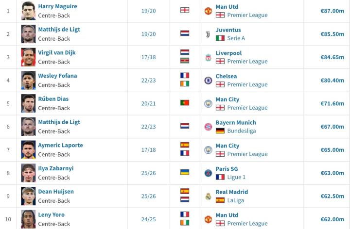 1. 马奎尔(19-20赛季莱斯特城>曼联) 8700万欧元