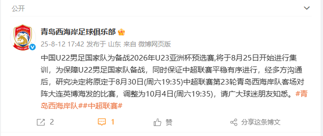 中国U22男足国家队为备战2026年U23亚洲杯预选赛,将于8月25日开始进行集训,为保障U22男足国家队备战,同时保证中超联赛平稳有序进行,经多方沟通后,研究决定将原定于8月30日(周六19:35)中超联赛第23轮青岛西海岸队客场对阵大连英博海发的比赛,调整为10月4日(周六19:35),请广大球迷朋友知悉。