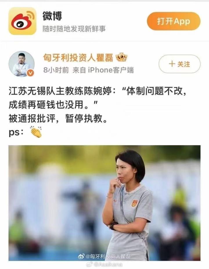 相关阅读:【官方:因发表不负责任评论,江苏无锡女足主帅陈婉婷被停赛1场】