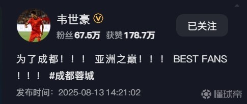 北京时间8月12日晚,2025-26亚冠精英联赛东亚区附加赛角逐,成都蓉城主场3-0淘汰曼谷联,成功晋级正赛。成都蓉城球员韦世豪在社交媒体里晒出主场震撼TIFO并写道:“为了成都!!!亚洲之巅!!!BEST FANS !!!”