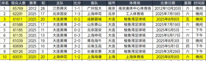 至此,中超历史上座前十全部跨过6万人大关。榜单前十名中,大连英博今年的主场比赛独占七席,另外三场分别是江苏舜天(后江苏队,已解散)65769人(第一),国安62291人(第二),申花60031人(第十)。