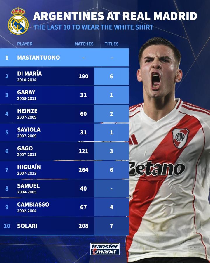 北京时间8月14日下午,皇马新援马斯坦托诺正式加盟球队,并完成了其在皇马体育城的亮相仪式。早些时候,德国转会市场列出了近十位加盟皇马的阿根廷球员的数据和成就。