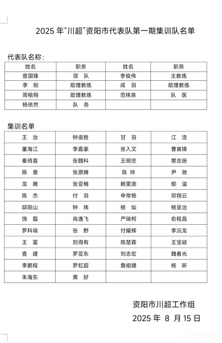 川超工作组负责人希望入选集训的球员戒骄戒躁、再接再厉,严格遵守训练纪律,刻苦投入、团结协作,全力以赴冲击最终的出战资格。同时,也向未能进入集训名单的球员表达感谢与鼓励:“资阳市足球代表队的大门始终向热爱足球的球员敞开,未来还有“三大球”联赛、“成德眉资”赛事、“巴蜀雄起杯”等多项省级赛事等待大家参与。”