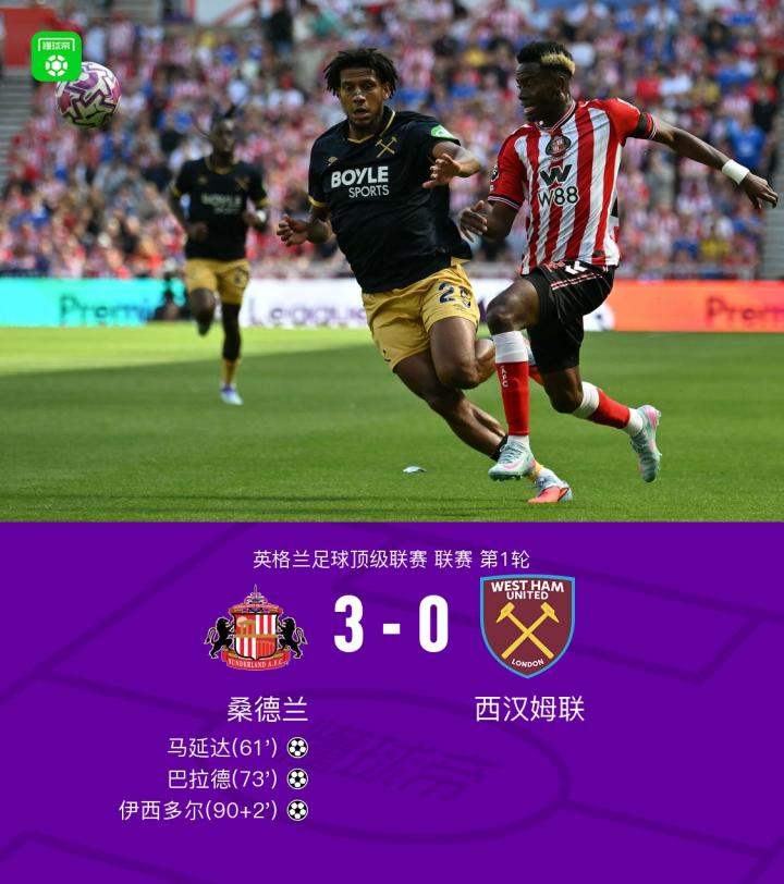 桑德兰3-0西汉姆联,马延达、伊西多尔破门,巴拉德建功
