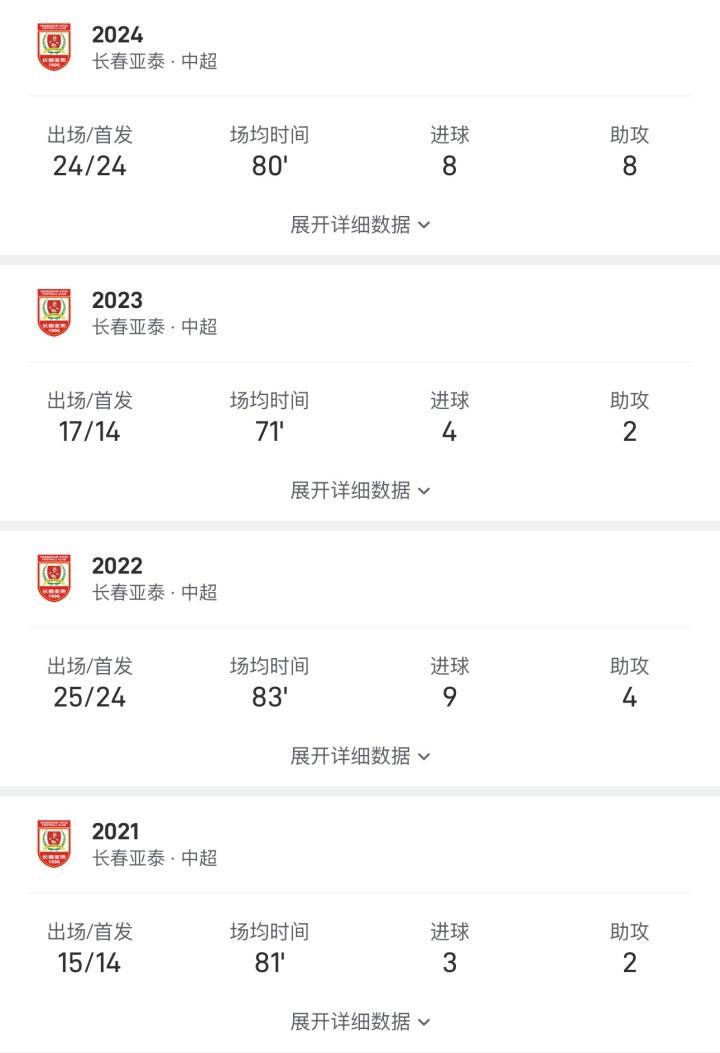 此前,在2021赛季至2024赛季,塞尔吉尼奥共代表长春亚泰出战81场中超联赛,贡献24粒进球和16次助攻。