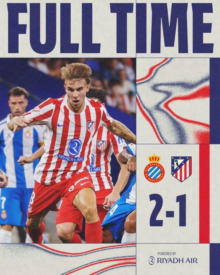 此役客场对阵西班牙人,马德里竞技凭借阿尔瓦雷斯上半场的进球取得领先,但在下半场连丢两球,最终1-2遭逆转。