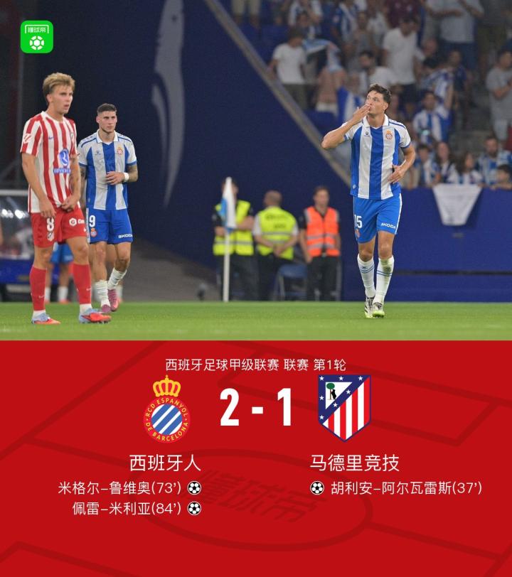马竞1-2遭西班牙人逆转,阿尔瓦雷斯任意球破门,米利亚制胜