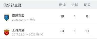 今年年初,陈彬彬离开上海海港,自由身加盟南通支云。2025赛季至今,陈彬彬已经代表南通支云出战19场比赛,打进4球。