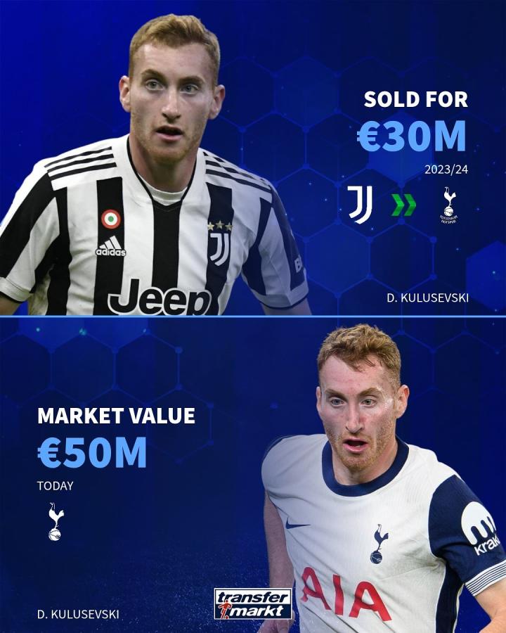 库卢塞夫斯基 23-24赛季转会费3000万欧→目前身价5000万欧