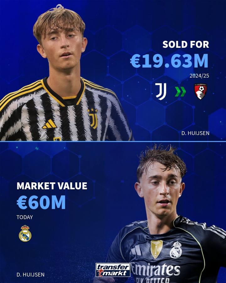 赫伊森 24-25赛季转会费1963万欧→目前身价6000万欧