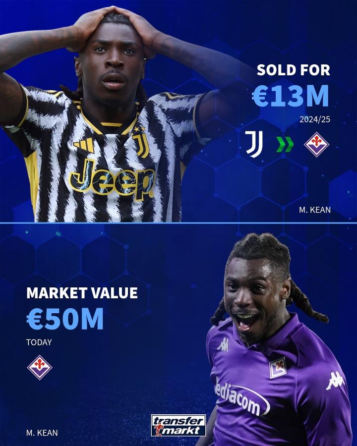 莫伊塞-基恩 24-25赛季转会费1300万欧→目前身价5000万欧