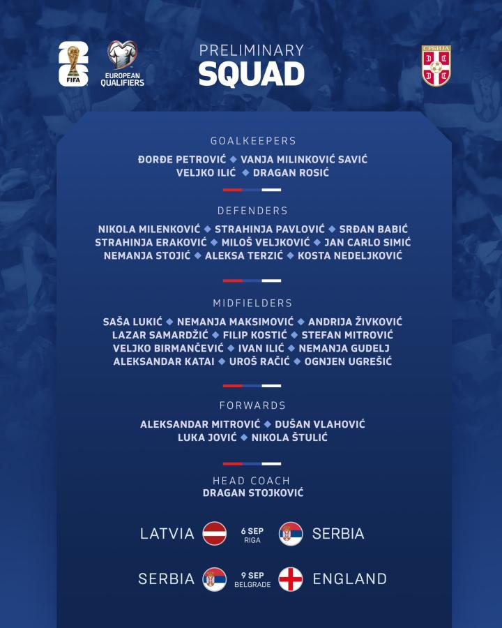 塞尔维亚国家队公布了参加世预赛的球员名单。其中,米特罗维奇、弗拉霍维奇领衔。