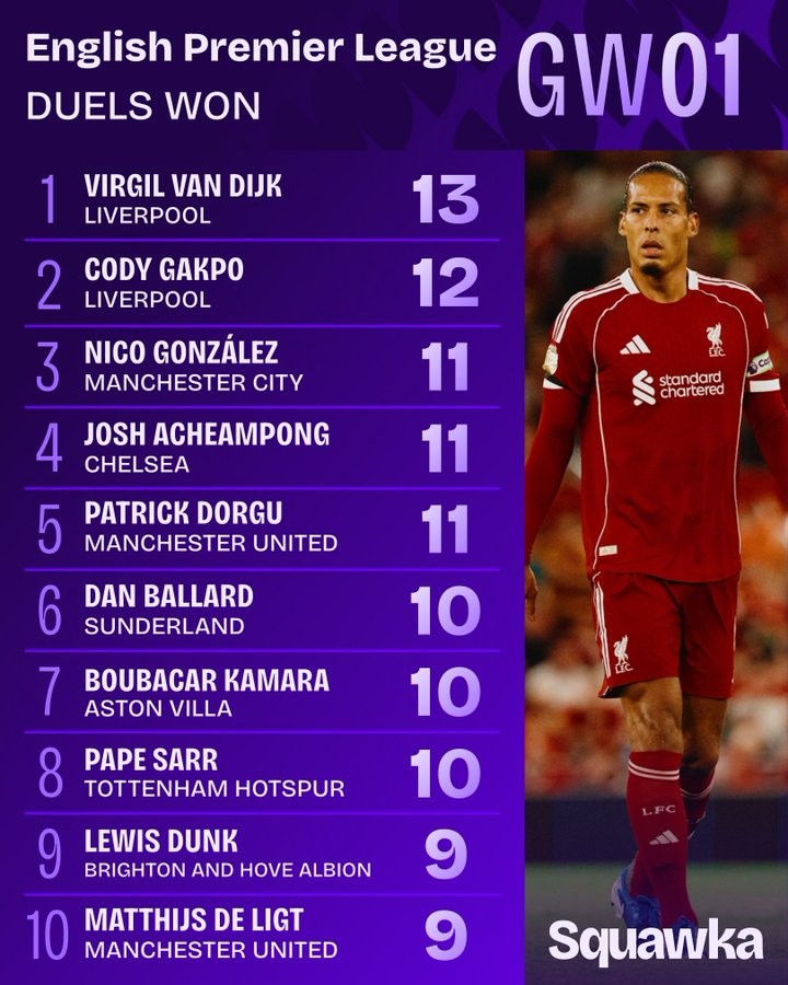 新赛季英超第一轮比赛已经全部结束,根据统计,范戴克是对抗成功(地面对抗+争顶)次数最多的球员,共有13次,而加克波位居第二,尼科-冈萨雷斯、阿昌庞、多古位居第三。