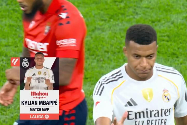 官方消息,姆巴佩当选皇家马德里对阵奥萨苏纳一役全场最佳。