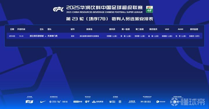 北京时间8月20日,据中国足协官方消息,沈寅豪执法浙江vs天津津门虎,徐强强担任VAR。