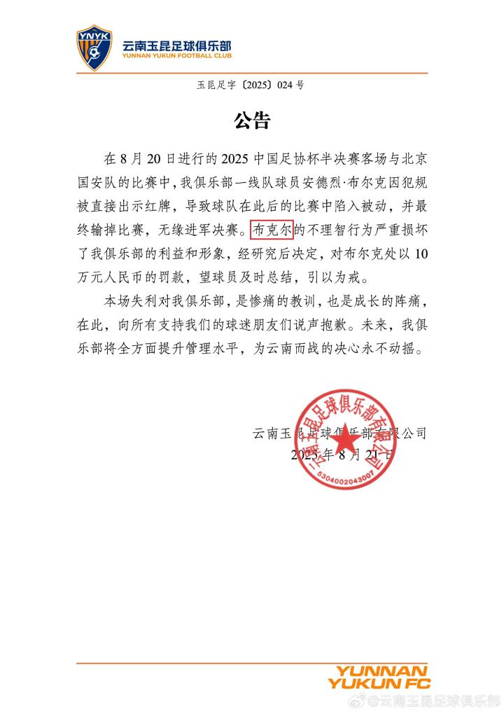 相关阅读:【官方:云南玉昆对布尔克处以10万元人民币罚款】