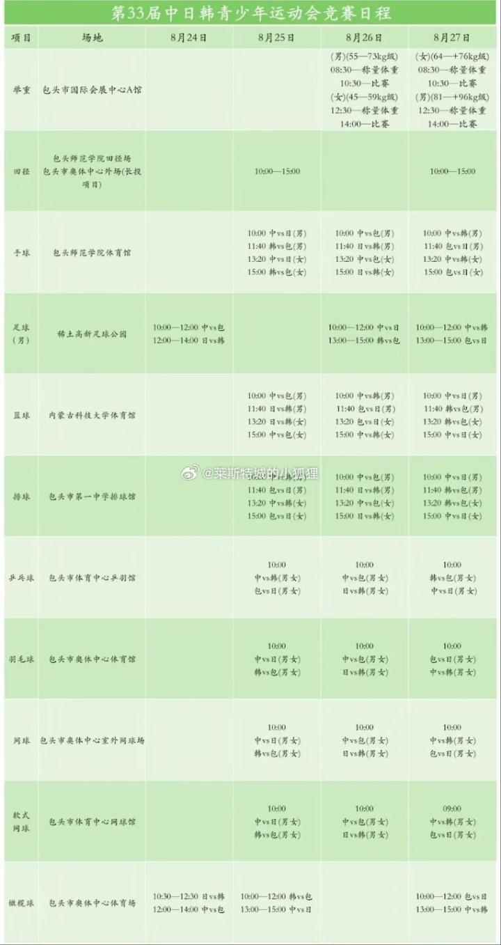 据博主@莱斯特城的小狐狸 消息,第33届中日韩青少年运动会赛程公布。