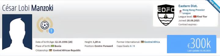 德转更新,前大连人外援曼佐基自由身加盟港超升班马东区。