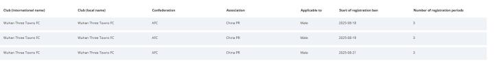 FIFA注册禁令公示平台新增3条关于武汉三镇的转会注册禁令,处罚期3个窗口。