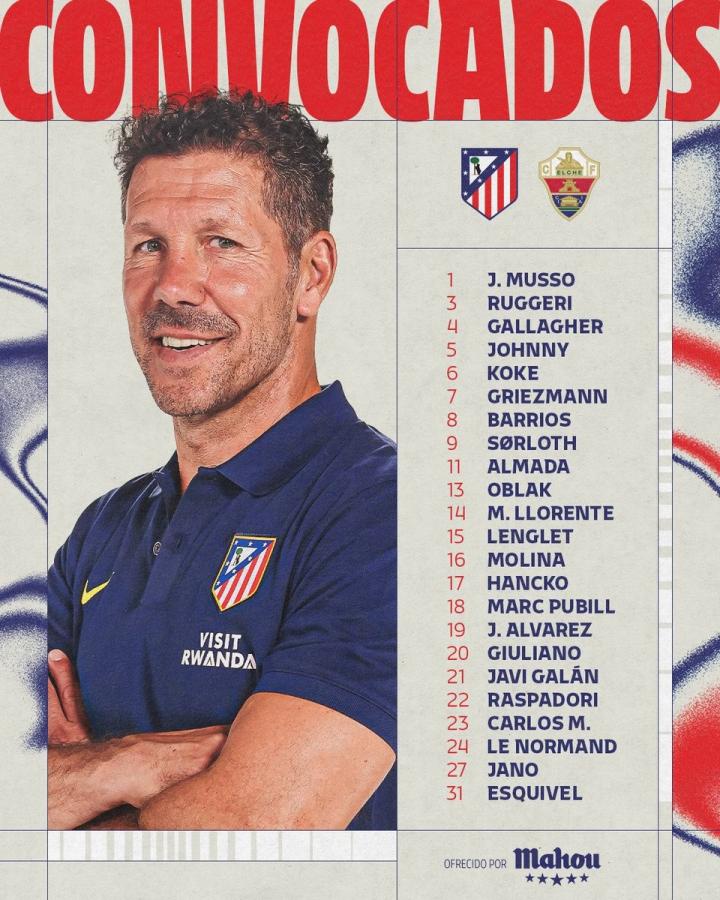 马德里竞技官方公布了西甲主场对阵埃尔切的比赛大名单,格列兹曼领衔,巴埃纳伤缺,比赛将于北京时间8月24日1:30进行。