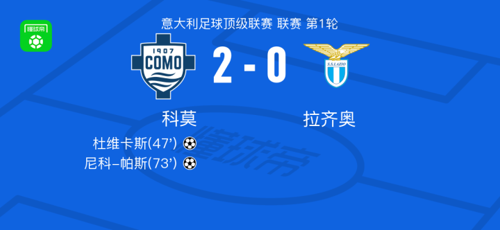 科莫2-0拉齐奥,杜维卡斯破门,尼科-帕斯锁定胜局
